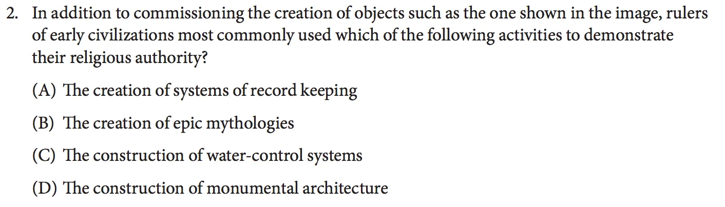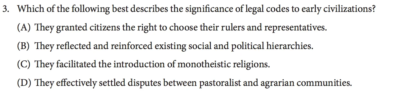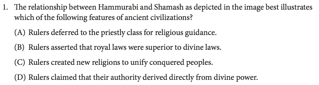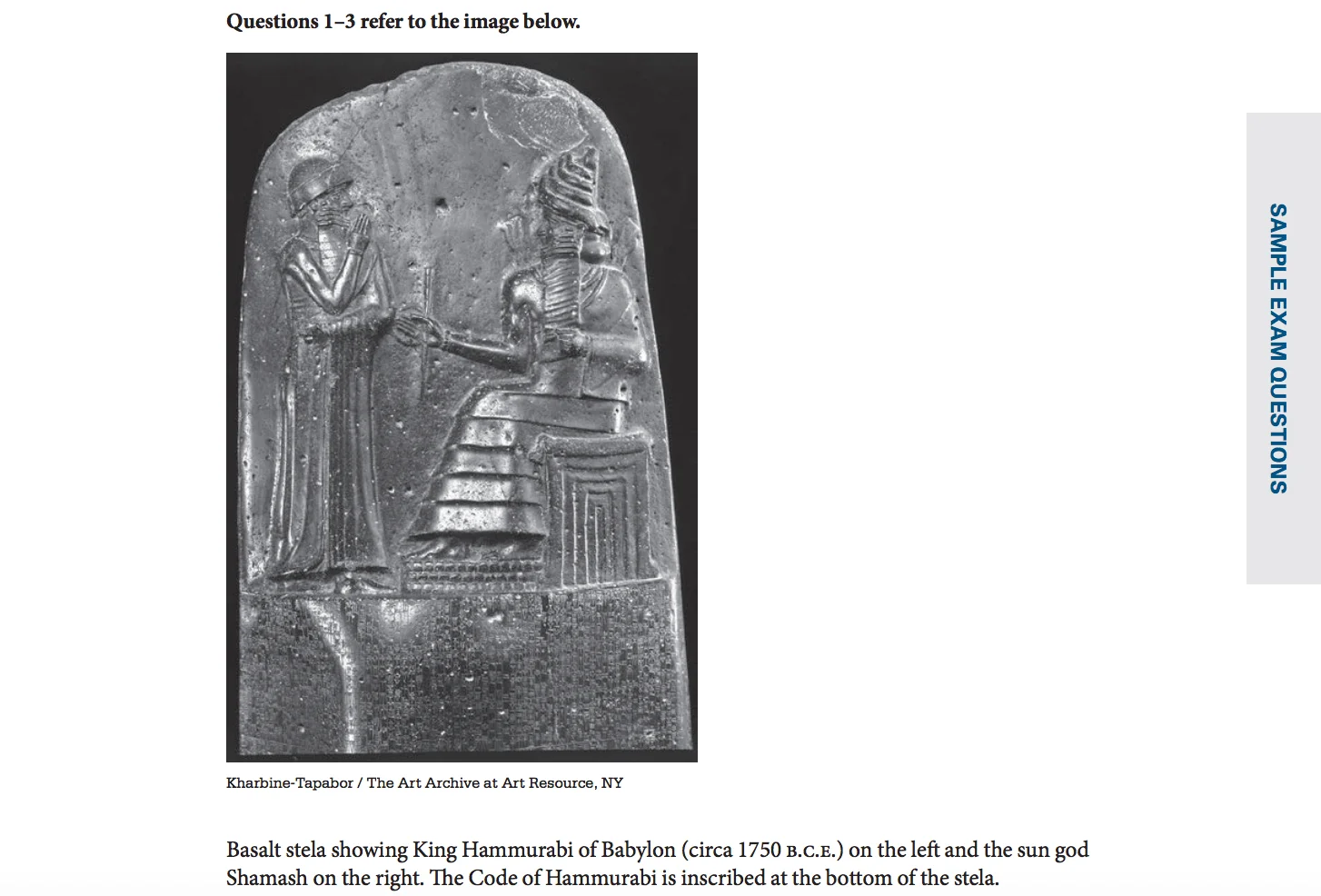 OK. So, each question will have a stimulus. Well, there it is. This one appears to be showing Hammurabi (yea, the law code guy). They will give you the stimulus (in this case an image) and a little description. What's next? The questions (2-5 questions based on the stimulus). For the answer key, scroll down.