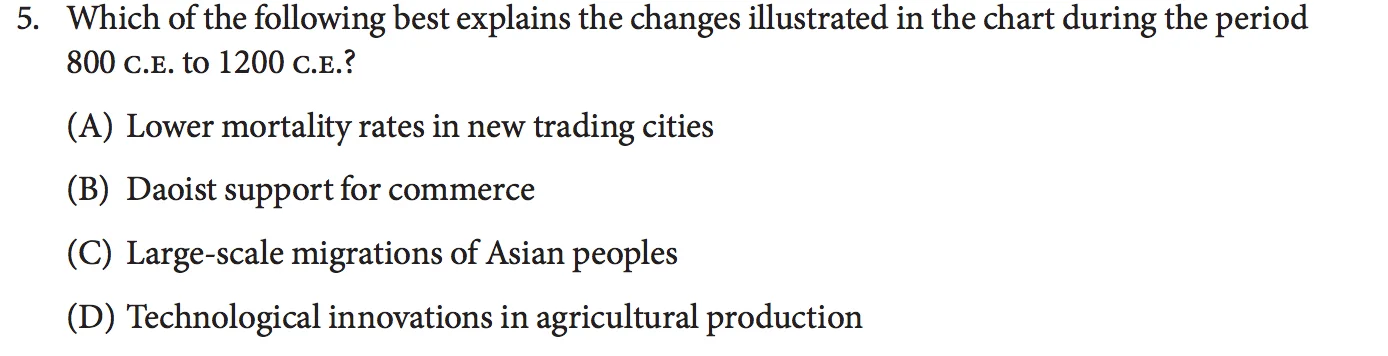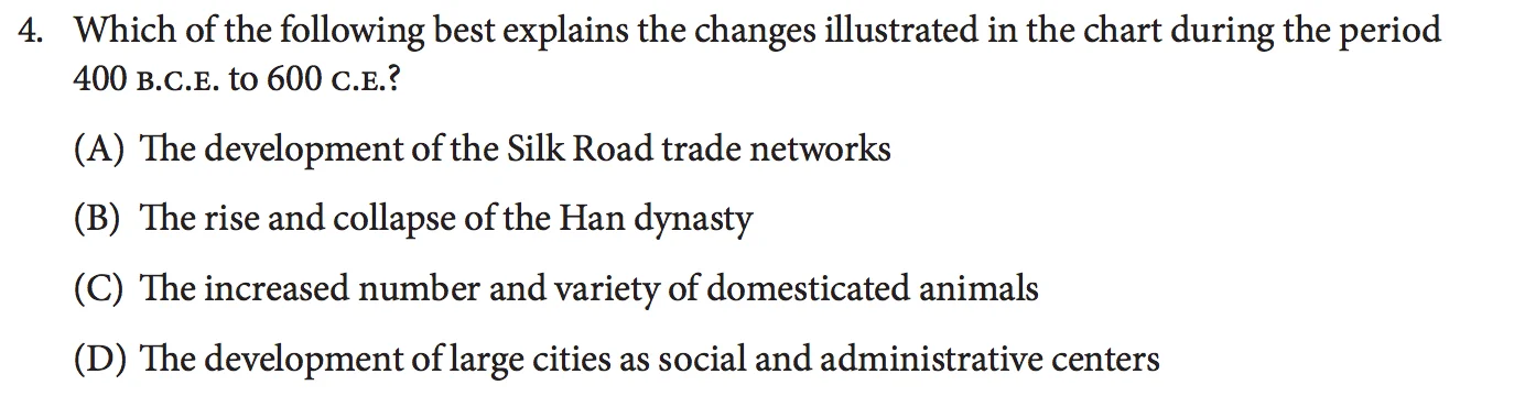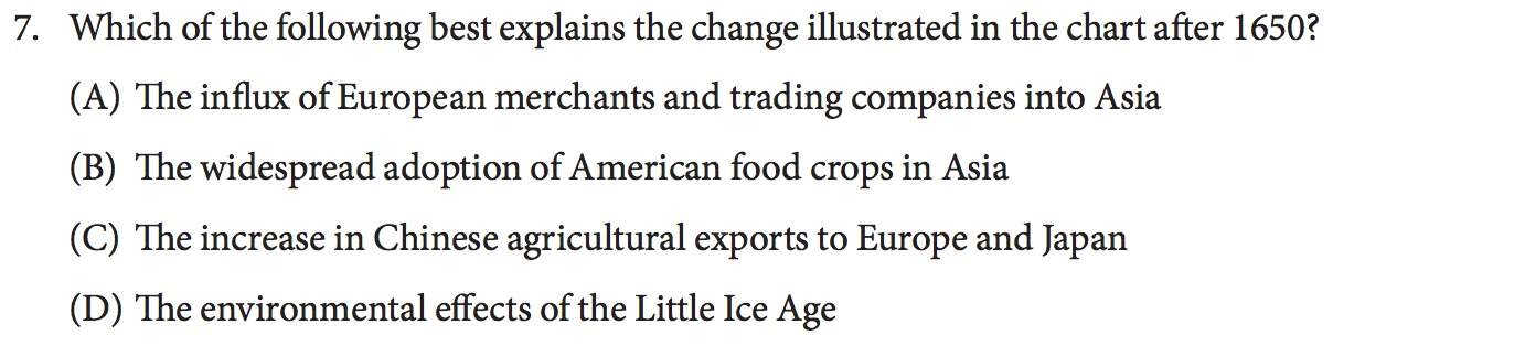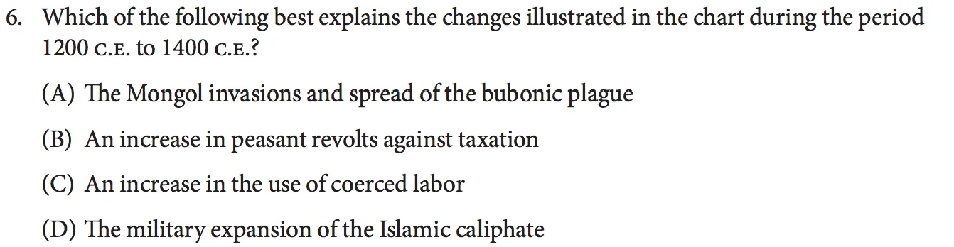 “The multiple-choice section will contain a number of sets of questions, with between two and five questions per set that ask students to respond to stimulus material: a primary or secondary source, including texts, images, charts, graphs, maps, etc. This stimulus material will reflect the types of evidence that historians use in their research on the past. The set of multiple-choice questions about the material will draw upon knowledge required by the curriculum framework, and each question will address one of the learning objectives for the course. Events and topics contained in the illustrative example lists will NOT appear in multiple-choice questions unless accompanied by text that fully explains that topic to the student.”